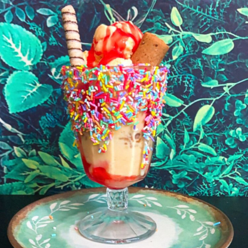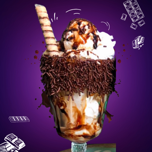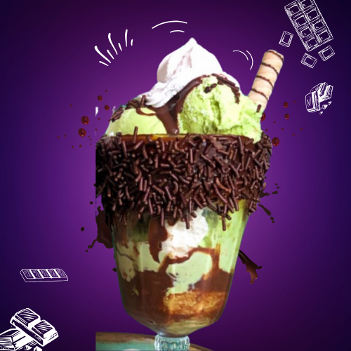 Sorvete de pistache com Borda de brigadeiro com granulado, Calda de creme de avelã, Chantilly, Bolacha waffer e Suspiro.