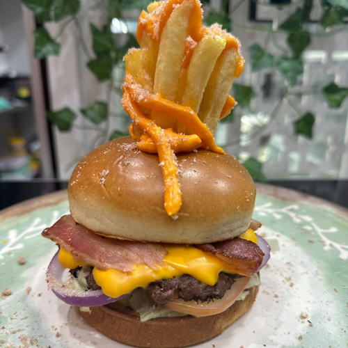 Pão brioche, hambúrguer artesanal, bacon, cheddar, alface, tomate, cebola, maionese especial, farofa bacon e batata.