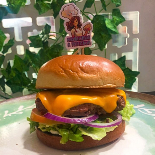 Pão de brioche, hambúrguer artesanal, queijo cheddar e maionese especial.